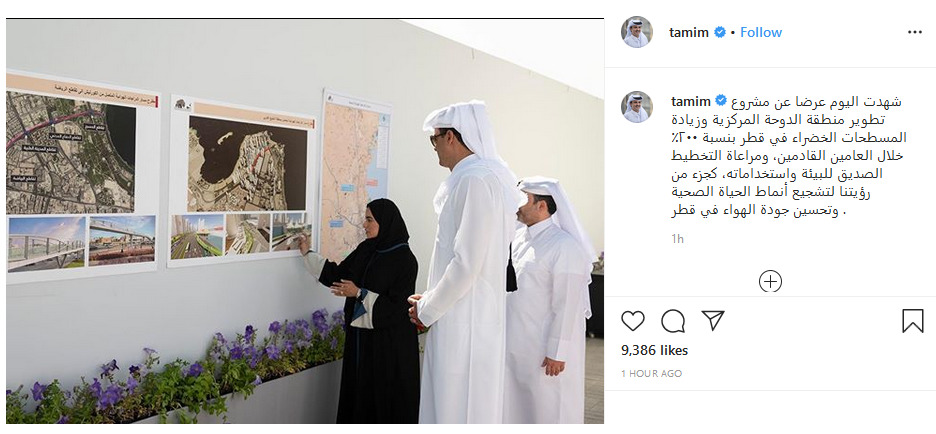 وقال صاحب السمو عبر إنستغرام: "شهدت اليوم عرضاً عن مشروع تطوير منطقة الدوحة المركزية وزيادة المسطحات الخضراء في قطر بنسبة ٢٠٠٪ خلال العامين القادمين، ومراعاة التخطيط الصديق للبيئة واستخداماته، كجزء من رؤيتنا لتشجيع أنماط الحياة الصحية وتحسين جودة الهواء في قطر".