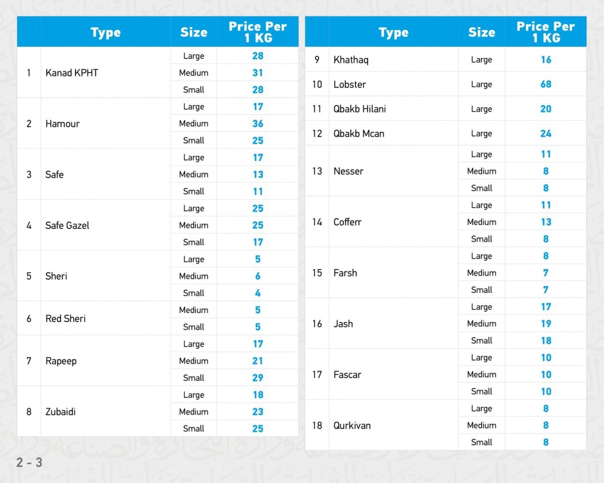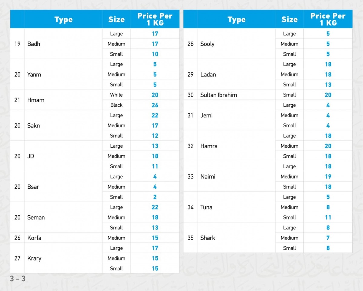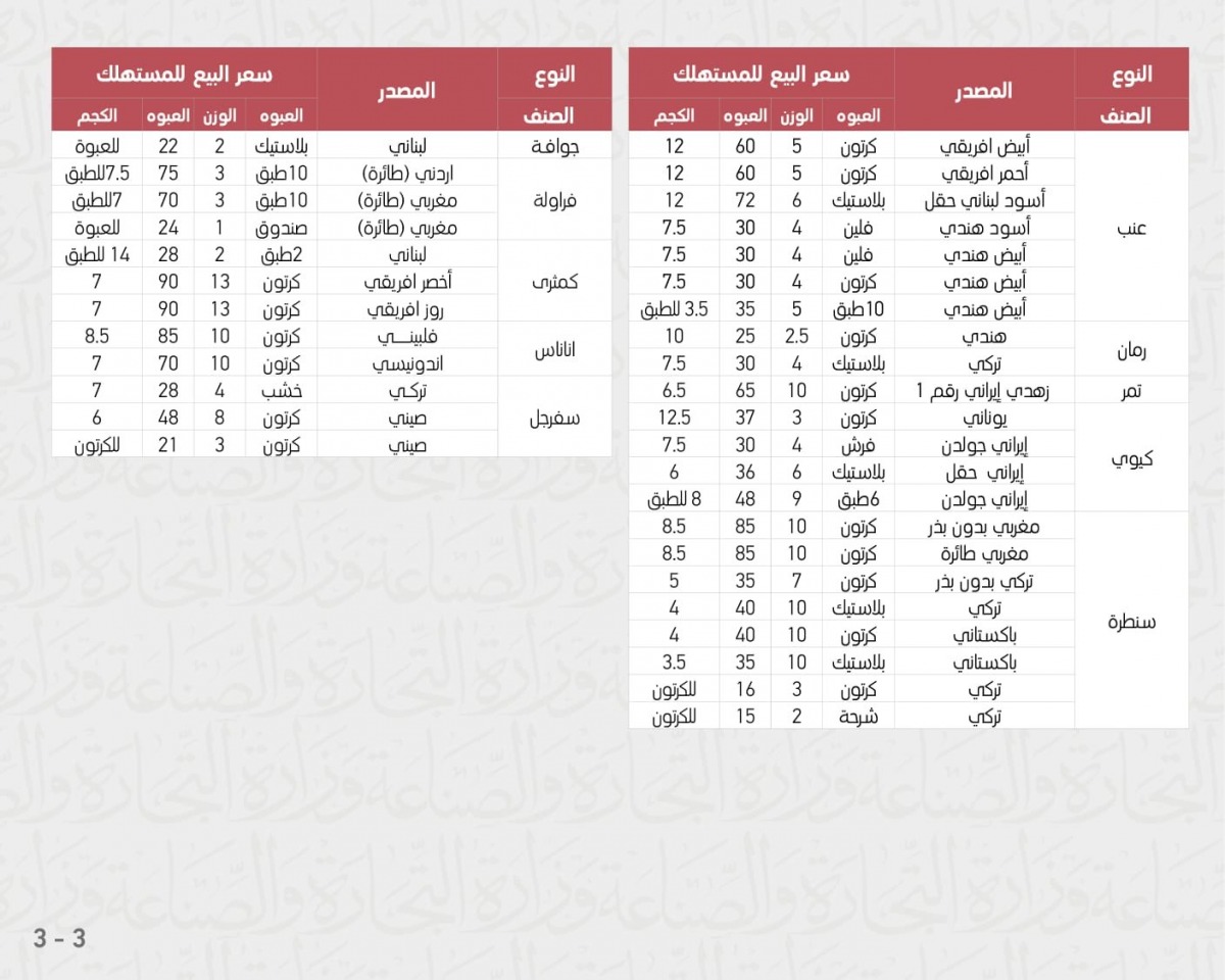 وكانت الوزارة قد أصدرت قرارات عن تثبيت أسعار الحد الأقصى لأسعار بيع الفواكه والخضروات والأسماك والمأكولات البحرية في منافذ البيع من 12 أبريل 2020 حتى تاريخ 18 أبريل 2020.