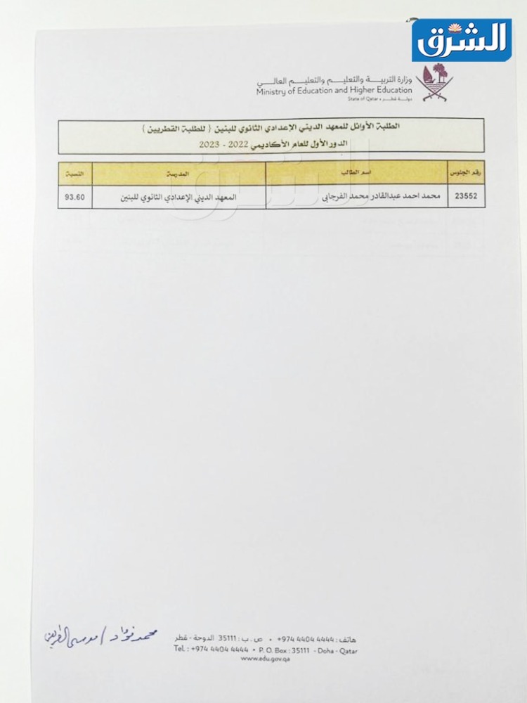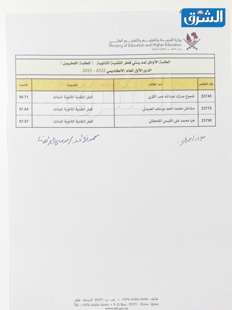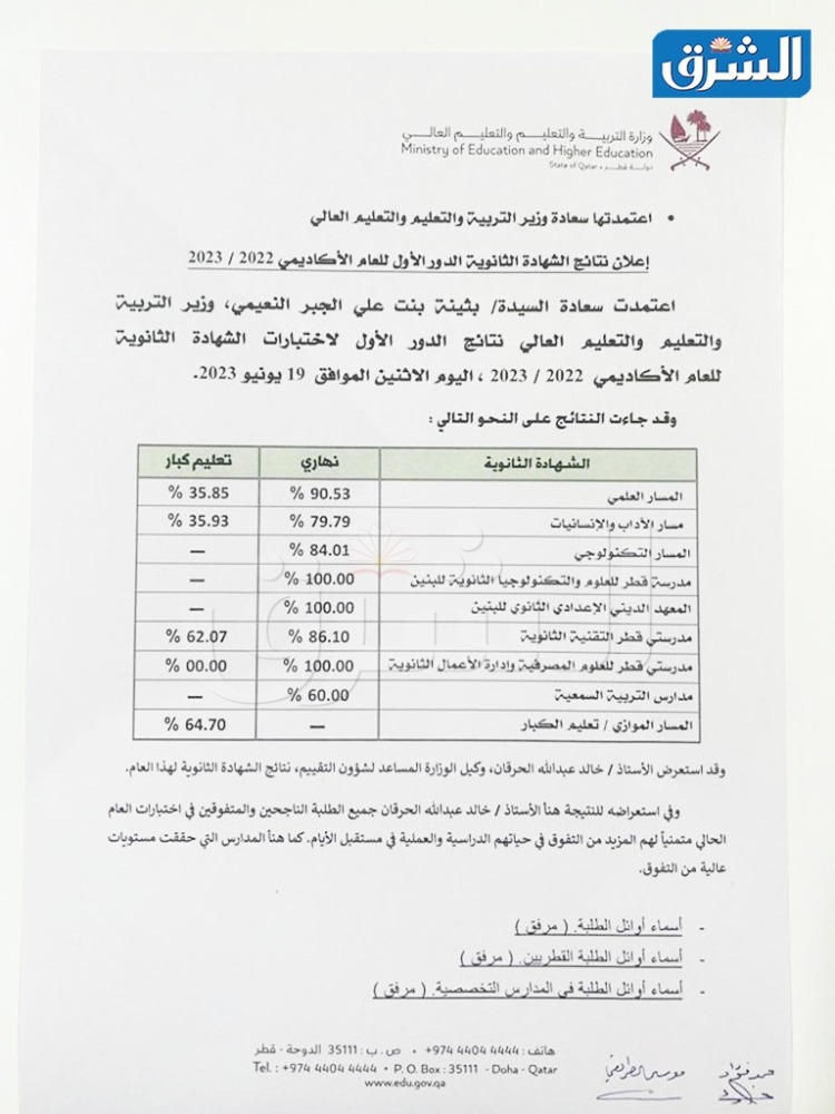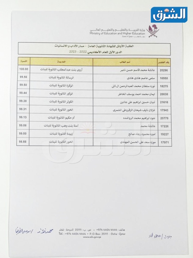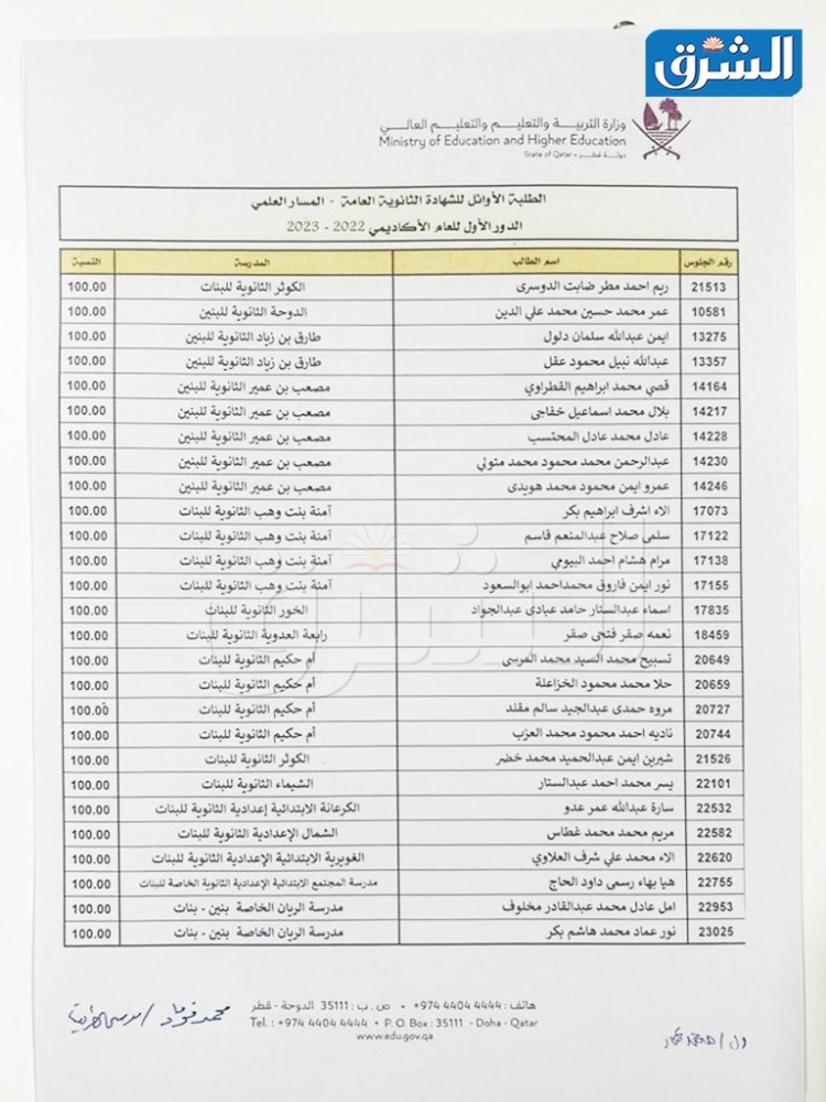 وقال السيد/ خالد عبدالله الحرقان وكيل الوزارة المساعد لشؤون التقييم خلال المؤتمر الصحفي للإعلان عن نتائج الثانوية العامة اليوم الإثنين إن 28 طالباً وطالبة حققوا العلامة الكاملة 100% في الثانوية العامة، بينهم طالبة قطرية هي ريم الدوسري.