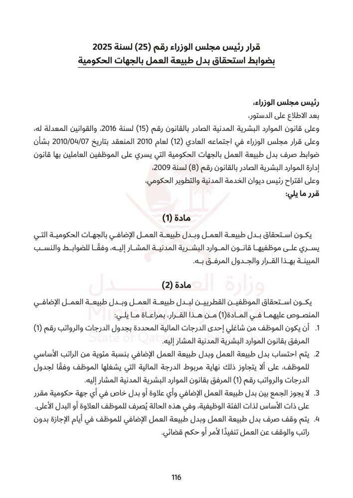 نشرت الجريدة الرسمية في عددها الصادر اليوم الأحد 19 أكتوبر 2025، نص قرار رئيس مجلس الوزراء رقم 25 لسنة 2025 بضوابط استحقاق بدل طبيعة العمل بالجهات الحكومية.