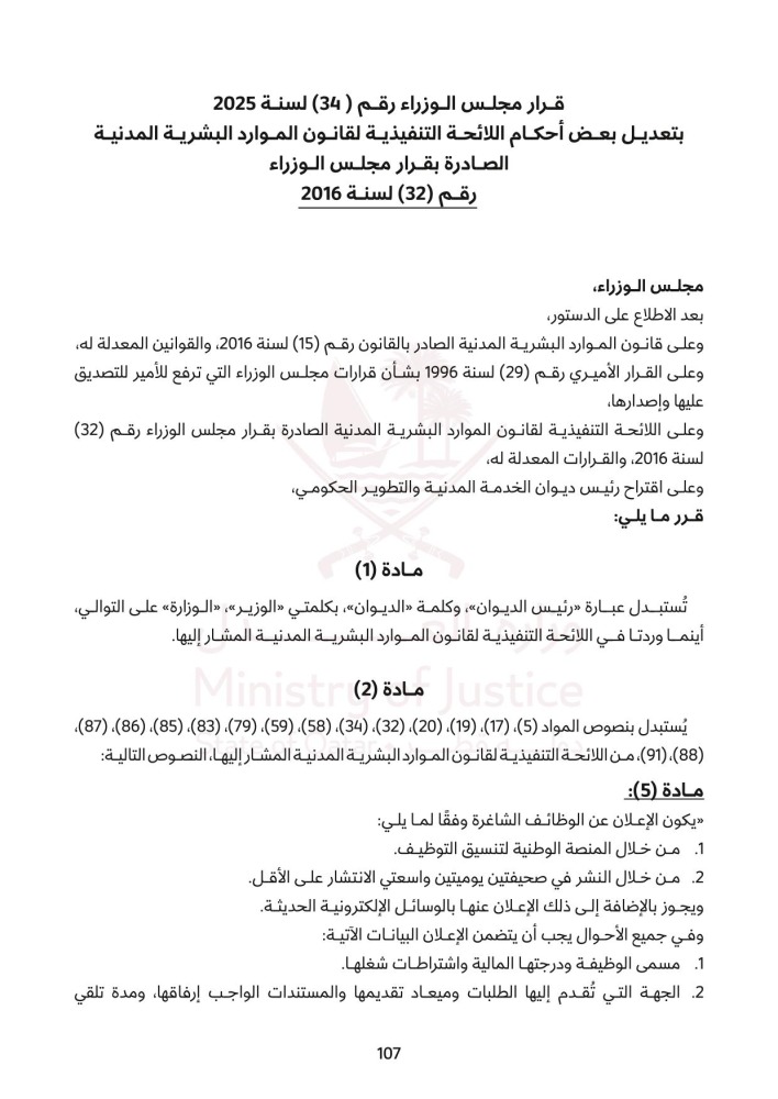 نشرت الجريدة الرسمية في عددها الصادر اليوم الأحد 19 أكتوبر 2025 نص قرار مجلس الوزراء رقم 34 لسنة 2025 بتعديل بعض أحكام اللائحة التنفيذية لقانون الموارد البشرية المدنية الصادرة بقرار مجلس الوزراء رقم 32 لسنة 2016.