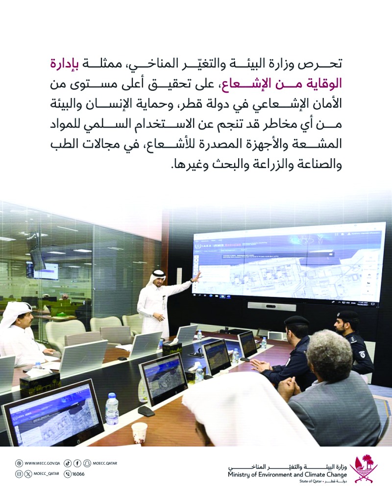 هذا وتحرص وزارة البيئة ممثلة بإدارة الوقاية من الإشعاع على تحقيق أعلى مستويات من الأمان الإشعاعي في قطر وحماية الإنسان والبيئة من أي مخاطر قد تنجم عن الاستخدام السلمي للمواد المشعة والأجهزة المصدرة للإشعاع في مجالات الطب والصناعة والزراعة والبحث وغيرها.