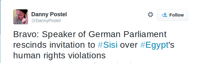 وكتب بوستل، مساعد مدير مركز دراسات الشرق الأوسط بجامعة دنفر الأمريكية، عبر حسابه على موقع التدوين المصغر تويتر اليوم الأربعاء: "برافو، رئيس البرلمان الألماني يلغي دعوة إلى السيسي، على خلفية انتهاكات مصر لحقوق الإنسان".