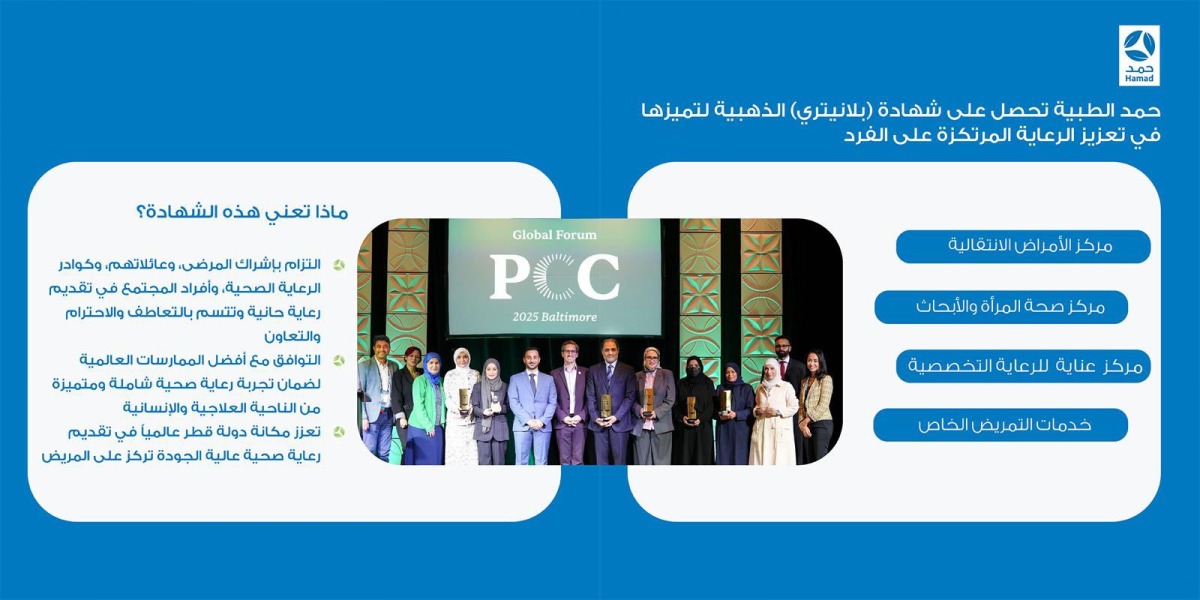 حصلت 4 مرافق وخدمات تابعة لمؤسسة حمد الطبية على شهادات بلانيتري الذهبية في منتدى بلانيتري العالمي المرموق بالولايات المتحدة، تقديراً لتميزها في تقديم الرعاية المرتكزة على الفرد.