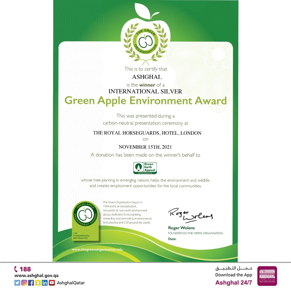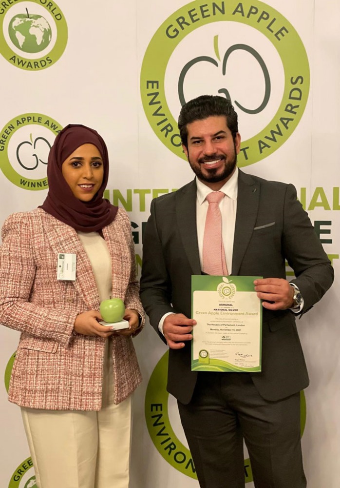 أعلنت هيئة الأشغال العامة "أشغال" عن فوز برنامج البنية التحتية للمناطق بجائزة البيئة الدولية Green Apple Award لعام 2021، حيث تسلم كل من المهندس سعود التميمي، مدير إدارة مشروعات الطرق، والمهندسة نور أشكناني، مهندس مشاريع ثاني، الجائزة في حفل أقيم بتاريخ 15 نوفمبر 2021 في فندق رويال هورسجاردز، بالعاصمة البريطانية لندن.