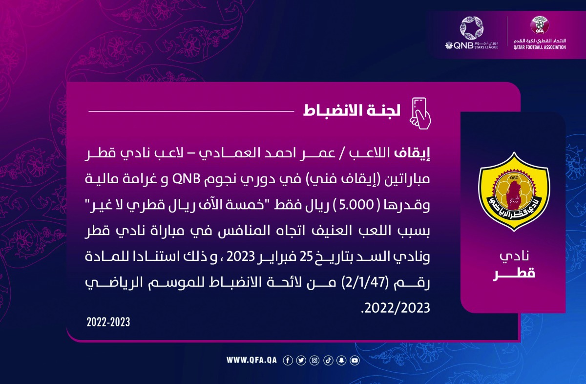 وفي اخر جلساتها الخاصة بإفراز العقوبات المقررة على مجريات الجولة السابعة عشرة من بطولة دوري النجوم قررت لجنة الانضباط التابعة للاتحاد القطري لكرة القدم ايقاف اللاعب لويز مارتن جونيزر لاعب الدحيل مباراة واحدة (ايقافا فنيا) مع تسليط غرامة مالية قدرها 5 آلاف ريال قطري وذلك بسبب اللعب العنيف في اللقاء الذي جمع فريقه بنادي قطر في الجولة الـ17 من الدوري، وذلك استنادا الى المادة 47/1/2 من لائحة الانضباط للموسم الرياضي 2022-2023، وهي المادة ذاتها التي تم تطبيقها على لاعب العربي عبدالله المعرفي ولاعب وسط قطر عمر العمادي، لكن العقوبة كانت مضاعفة حيث قررت الانضباطية ايقاف المعرفي والعمادي مباراتين (ايقاف فني) في مباراة الاول امام فريق الغرافة والثاني امام الدحيل وغرامة مالية وقدرها 5 آلاف ريال بسبب اللعب العنيف بالجولة العاشرة المؤجلة والتي اقيمت قبل الجولة الـ17 بخمسة ايام فقط، وهو ما يستدعي اعادة النظر في فحوى قراري الانضباطية التي استهدفت من خلالهما لاعبى العربي وقطر بتغليظ العقوبة دون لاعب الدحيل، وهو ما طرح التساؤلات في الشارع الرياضي بخصوص المعايير التي تطبقها لجنة الانضباط عند اتخاذ قراراتهامع التأكيد على أن تعي اللجنة أهمية حياديتها بين الاندية ولا أن تكون سبباً في خلق أي حساسية او ضغينة او عداوة بين جماهير الاندية.