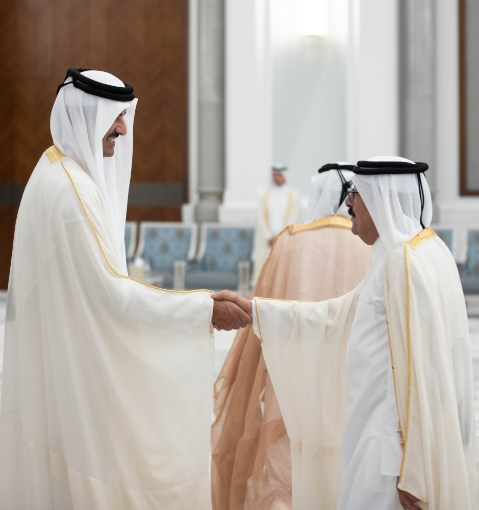 فقد استقبل سموه -حفظه الله- بعد صلاة العيد كلا من معالي الشيخ محمد بن عبدالرحمن بن جاسم آل ثاني رئيس مجلس الوزراء وزير الخارجية، وسعادة السيد حسن بن عبدالله الغانم رئيس مجلس الشورى، وأصحاب السعادة الشيوخ والوزراء ووكلاء الوزارات وأعضاء مجلس الشورى، وجموع المهنئين من السادة المواطنين.