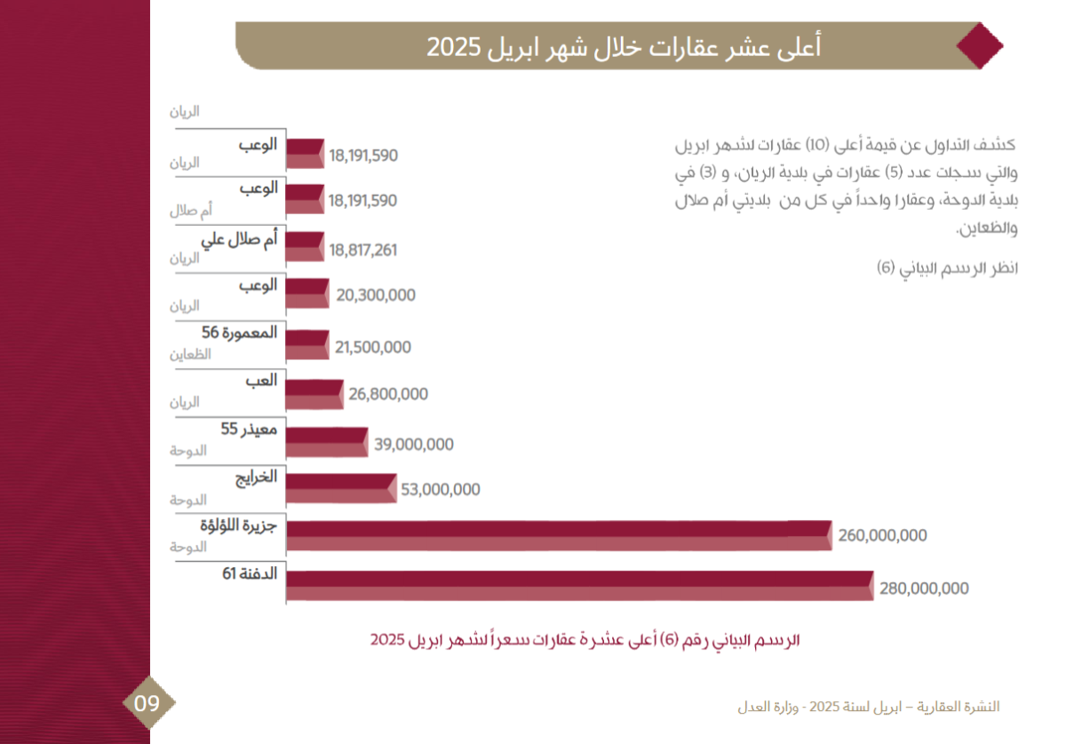 كشف التداول عن قيمة أعلى 10 عقارات في قطر لشهر أبريل 2025 والتي سجلت عدد 5 عقارات في بلدية الريان و3 في بلدية الدوحة، وعقاراً واحداً في كل من بلديتي أم صلال والظعاين.