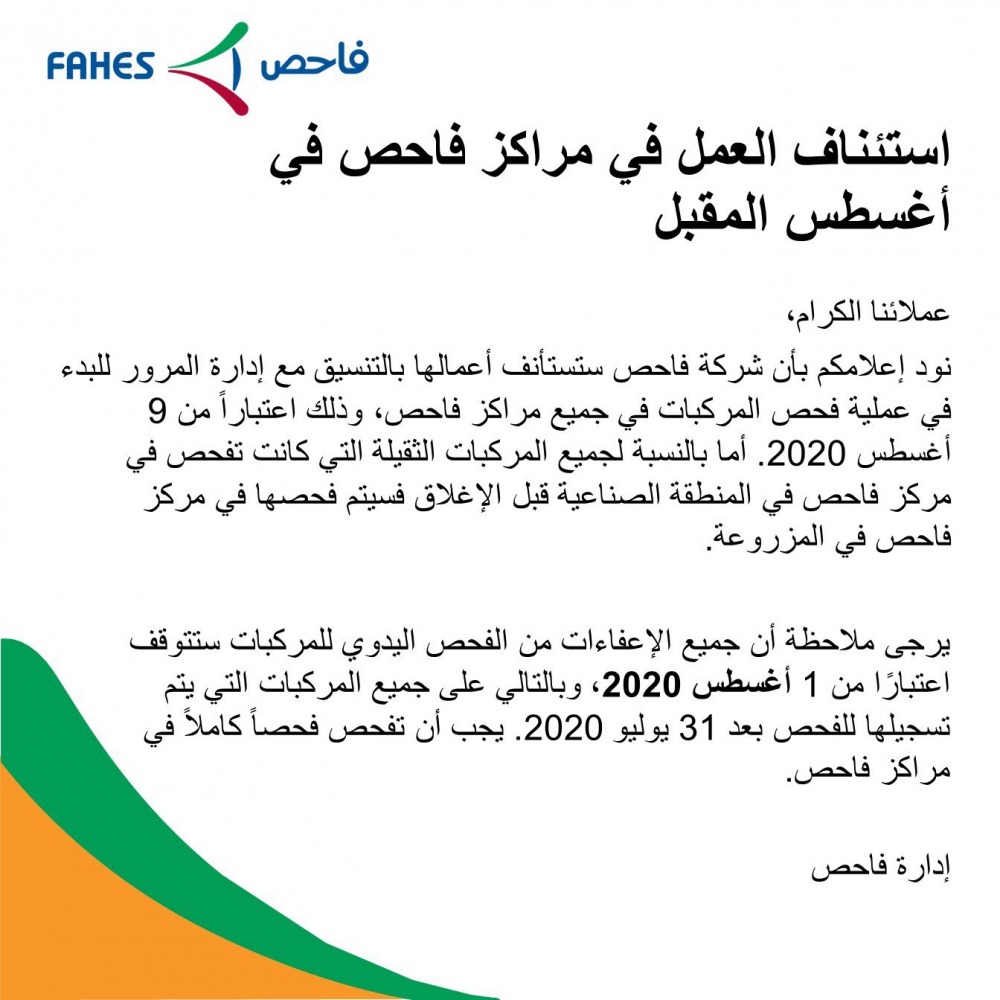 وقالت الشركة عبر حسابها الرسمي على تويتر: نود إعلامكم بأن شركة فاحص ستستأنف أعمالها للبدء في عملية فحص المركبات في جميع مراكز فاحص، وذلك اعتبارا من 9 أغسطس 2020.