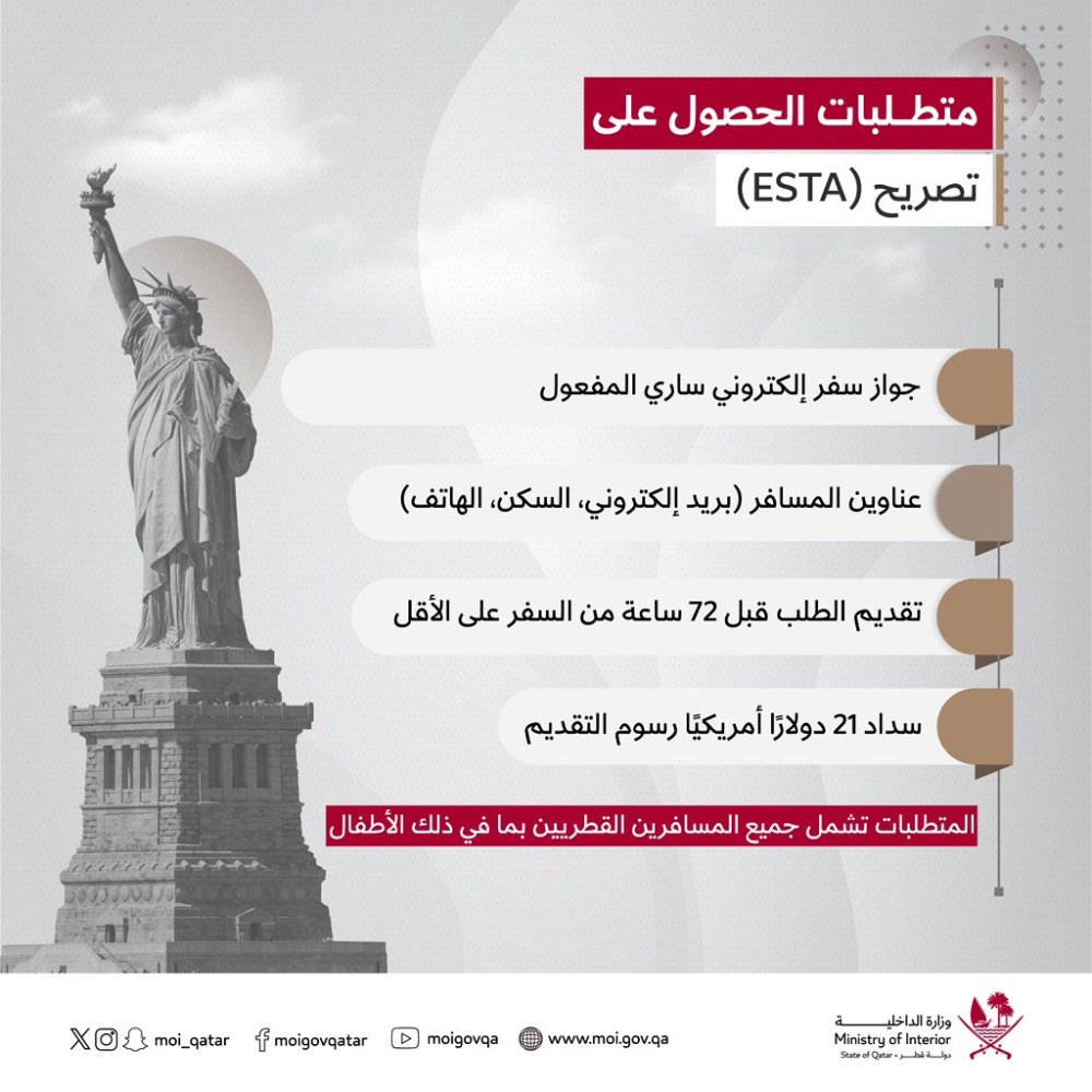 أوضحت وزارة الداخلية خطوات التقديم على النظام الإلكتروني لتصاريح السفر (ESTA) الذي يسمح لمواطني دولة قطر بالسفر إلى الولايات المتحدة الأمريكية بدون تأشيرة، بموجب برنامج الإعفاء من التأشيرة (VWP).