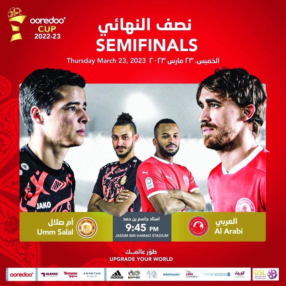 تقام يوم غد الخميس مواجهتا الدور النصف النهائي من بطولة كأس Ooredoo، حيث تجمع المباراة الأولى بين العربي وام صلال والثانية بين السد والدحيل في تمام الساعة 21:45 مساء ويلعب العربي مع الصقور على استاد جاسم بن حمد بنادي السد، فيما يقابل السد غريمه التقليدي نادي السد باستاد سحيم بن حمد بنادي قطر، وسيكون طموح الأندية الأربعة هو الظفر ببطاقتي التأهل للدور النهائي من كأس Ooredoo، وتُشكل المباراتين أهمية خاصة لكل فريق.