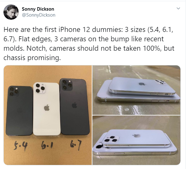 ونشر المسرب سوني ديكسون على صفحته بـ "تويتر" صورا لقوالب (أيفون 12) بثلاثة أحجام، وتبين الصور أن التصميم الأخير لا يختلف عن باقي تصاميم أبل إلى في بعض الجزئيات، ويشبه التصميم الأخير تصميم آيباد برو (iPad Pro) مع حواف مسطحة.