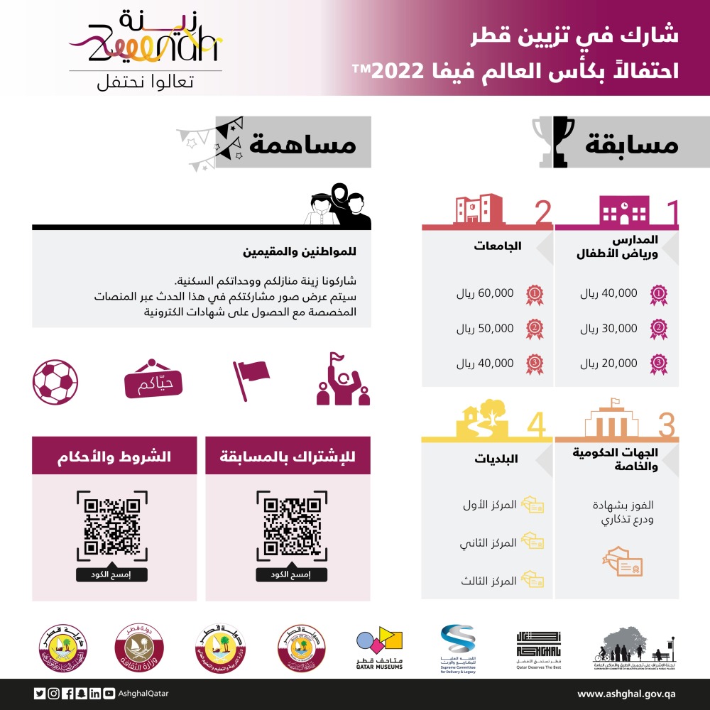 وعلى الراغبين في المشاركة يرجى زيارة موقع المبادرة https://Zeeenah.ashghal.gov.qa واتباع الخطوات المذكورة للتسجيل مع ضرورة الالتزام بالشروط والضوابط والقواعد الإرشادية للمسابقة حتى يتم قبول المشاركة، وسيكون التسجيل على مرحلتين: المرحلة الأولى وهي مرحلة ما قبل التنفيذ، والتي سيتقدم المتسابق من خلالها بتقديم مقترحات التزيين بطريقة الوصف مع صور توضيحية أو رسومات، وبعد التأكد من عدم وجود أي مخالفات للاشتراطات سيتم التواصل مع المتسابق للبدء بالتنفيذ، ومن ثم التقديم النهائي بصور المشاركة بعد إتمام التنفيذ، ليتم تقييمها من قبل لجان التحكيم.