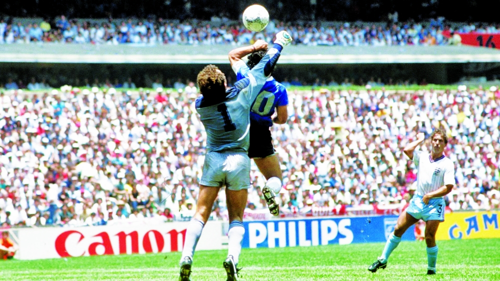من أشهر القصص الشهيرة في تاريخ دورات كأس العالم، والتي لا زالت تروى إلى يومنا هدا، قصة الهدف التاريخي الذي سجله الأسطورة الأرجنتيني دييغو أرماندو مارادونا بيده، في شباك المنتخب الإنجليزي في ربع نهائي مونديال ميكسيكو 1986، والدي توجت به الأرجنتين، حيث عرض المنتخب الإنجليزي إلى مظلمة صارخة في مونديال 1986 بالمكسيك، عندما غالط الأرجنتيني دييغو أرماندو مارادونا الحارس الإنجليزي بيتر شيلتون وسجل هدفا بيده احتسبه الحكم التونسي السابق علي بن ناصر، وأثبتت الإعادة أن مارادونا استخدم يده، وفتح هذا الهدف الأبواب أمام الباب للأرجنتين لبلوغ النهائي والتتويج بالمونديال للمرة الثانية، وفي المقابل ودعت إنجلترا البطولة وسط احتجاجات على الهدف الذي بقي تاريخيا.