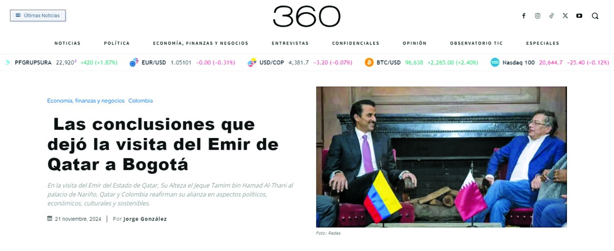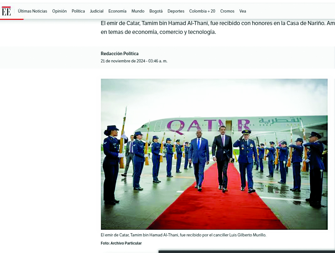 من جهته، أشار راديو كولومبيا إلى أن زيارة حضرة صاحب السمو الشيخ تميم بن حمد آل ثاني إلى قصر نارينيو، تؤكد أن قطر وكولومبيا عازمتان على تطوير الشراكة في الجوانب السياسية والاقتصادية والثقافية والمستدامة. وتمثل الزيارة الرسمية لسمو الأمير إلى بوغوتا حدثا تاريخيا في العلاقات الثنائية، حيث أكدت قطر وكولومبيا التزامهما بالتعاون السياسي والاقتصادي. وتضمنت المباحثات الرسمية، التي جرت في قصر نارينيو في بوغوتا، مشاركة رئيس كولومبيا غوستافو بيترو وكبار المسؤولين من البلدين، الذين أجروا سلسلة من المناقشات الاستراتيجية تراوحت بين التعاون السياسي وتعزيز العلاقات الاقتصادية والثقافية. وكان أحد الجوانب الرئيسية للزيارة هو إعلان كولومبيا عن افتتاح سفارة لها في الدوحة، مما يؤكد العلاقات الدبلوماسية المتنامية بين البلدين. ويتم الاحتفال بهذه الخطوة كدليل على الجهود المتبادلة لتعميق العلاقات في مختلف المجالات. وتابع التقرير: تم خلال اللقاء التوقيع على عدد من مذكرات التفاهم في قطاعات استراتيجية مثل التجارة والنقل والطاقة والرياضة والسياحة، بهدف خلق منصات للتعاون والتبادل بين قادة الأعمال والجهات الحكومية في البلدين.