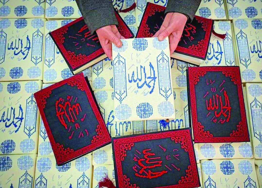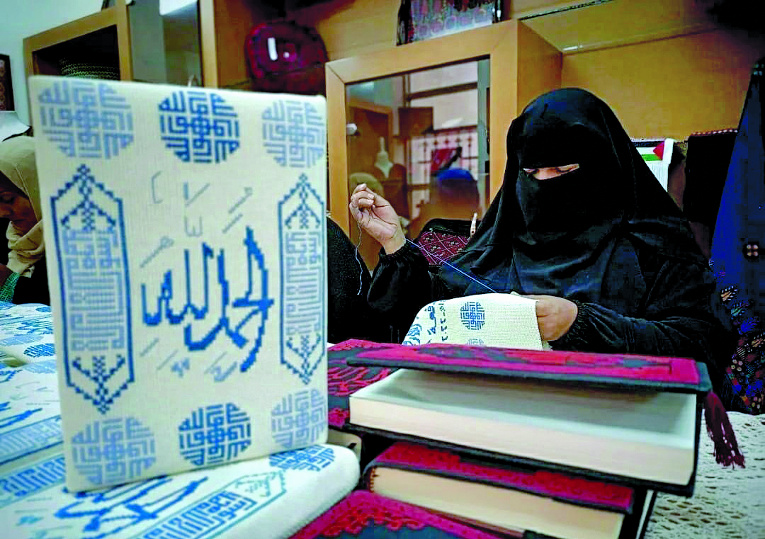 5 أغلفة للقرآن الكريم طرزتها نعمة بشغف ومتعة متناسية التعب والجهد الكبير المبذول في إنجازها، فبعد التعب ستحصل على مبلغ يساعد في إعالة أسرتها المكونة من 12 فردا.