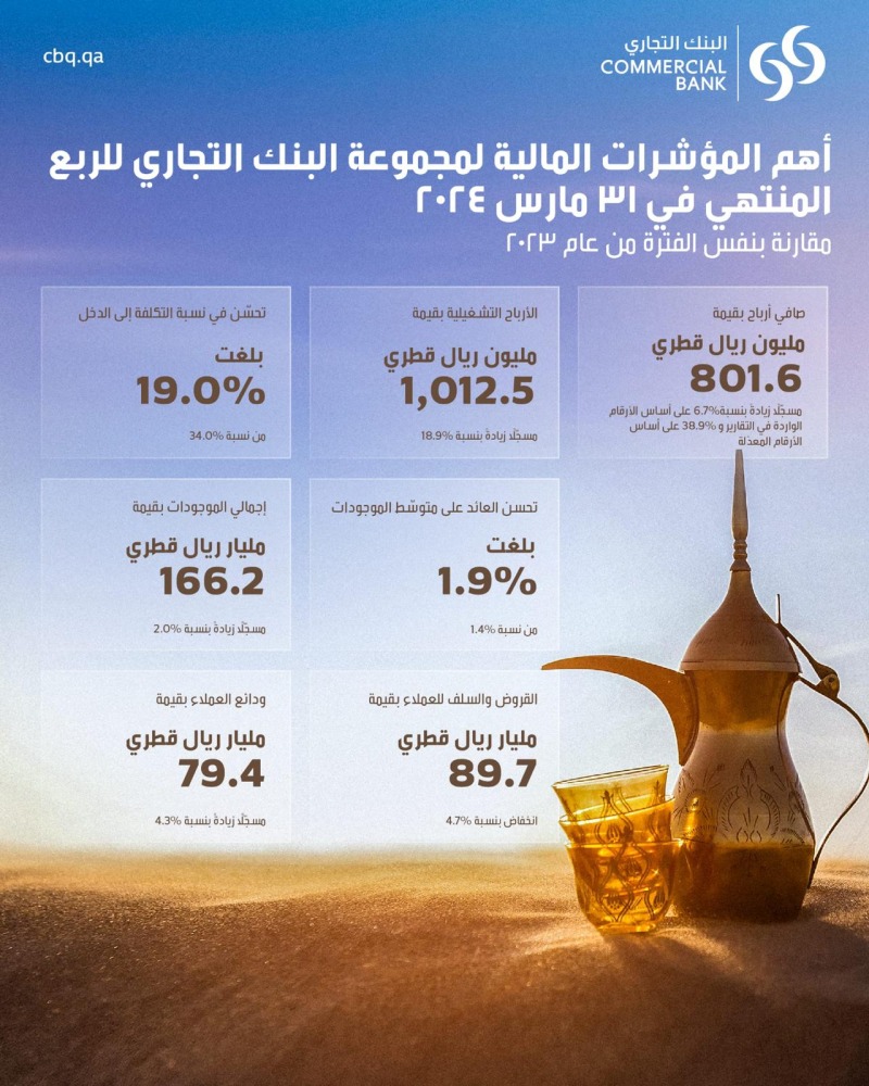أعلن البنك التجاري وشركاته التابعة والزميلة امس عن نتائجه الماليّة للربع المنتهي في 31 مارس 2024. وأعلنت المجموعة عن صافي أرباح بقيمة 801.6 مليون ريال قطري ممثلاً زيادة بنسبة 6.7% مقارنةً بصافي أرباح بقيمة 751.3 مليون ريال قطري في الربع الأول من العام 2023 الواردة في التقارير والتي تم تعديلها لتصبح 577.3 مليون ريال قطري للفترة نفسها من العام 2023. أبرز المؤشّرات الماليّة للمجموعة مقارنةً بالفترة نفسها من العام 2023: صافي أرباح بقيمة 801.6 مليون ريال قطري، مسجّلًا زيادةً بنسبة 6.7% على أساس الأرقام الواردة في التقارير و 38.9% على أساس الأرقام المعدَلة، الأرباح التشغيلية بقيمة 1,012.5 مليون ريال قطري، مسجّلةً زيادةً بنسبة 18.9%، تحسّن في نسبة التكلفة إلى الدخل فبلغت 19.0% من 34.0%، معدّل كفاية رأس المال قوي بنسبة 16.4%، تحسّن العائد على متوسّط الموجودات فبلغ 1.9% من نسبة 1.4%، إجمالي الموجودات بقيمة 166.2 مليار ريال قطري، مسجّلًا زيادةً بنسبة 2.0%، القروض والسلف للعملاء بقيمة 89.7 مليار ريال قطري، أي بانخفاض بنسبة 4.7% عن مارس 2023، ودائع العملاء بقيمة 79.4 مليار ريال قطري، مسجّلةً زيادة بنسبة 4.3% عن مارس 2023، النجاح في إصدار سندات دوليّة بالدولار الأمريكي بقيمة إجماليّة قدرها 750 مليون دولار أمريكي، قامت وكالة "فيتش" برفع تصنيف البنك التجاري بالنسبة إلى قدرة المصدّر على الوفاء بالتزاماته طويلة الأجل (IDRs) إلى "A" وتصنيفات قدرة المصدّر على الوفاء بالتزاماته قصيرة الأجل إلى "F1" مع نظرة مستقبليّة مستقرّة، صنفت فوربس البنك ضمن أفضل 30 بنكًا في الشرق الأوسط لعام 2024.