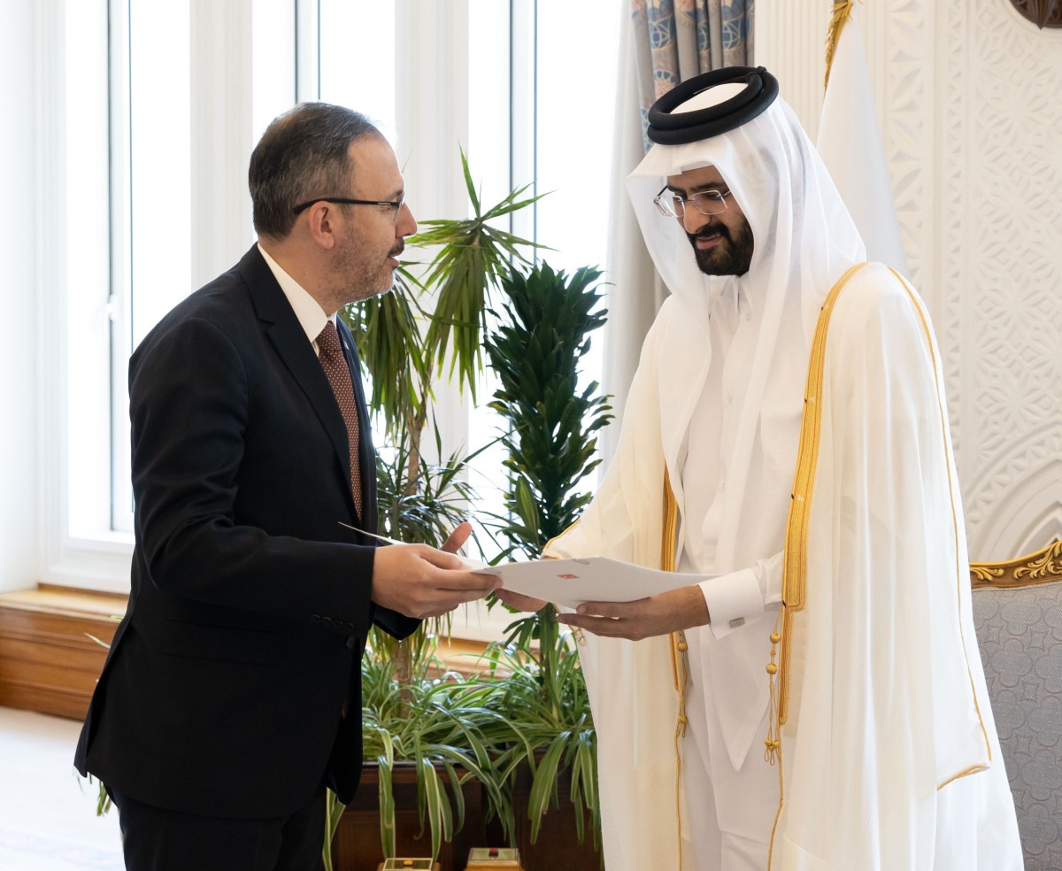 تسلم الرسالة سمو الشيخ عبدالله بن حمد آل ثاني نائب الأمير، خلال استقباله سعادة الدكتور محمد قصاب أوغلو وزير الشباب والرياضة بالجمهورية التركية في مكتبه بالديوان الأميري صباح اليوم.