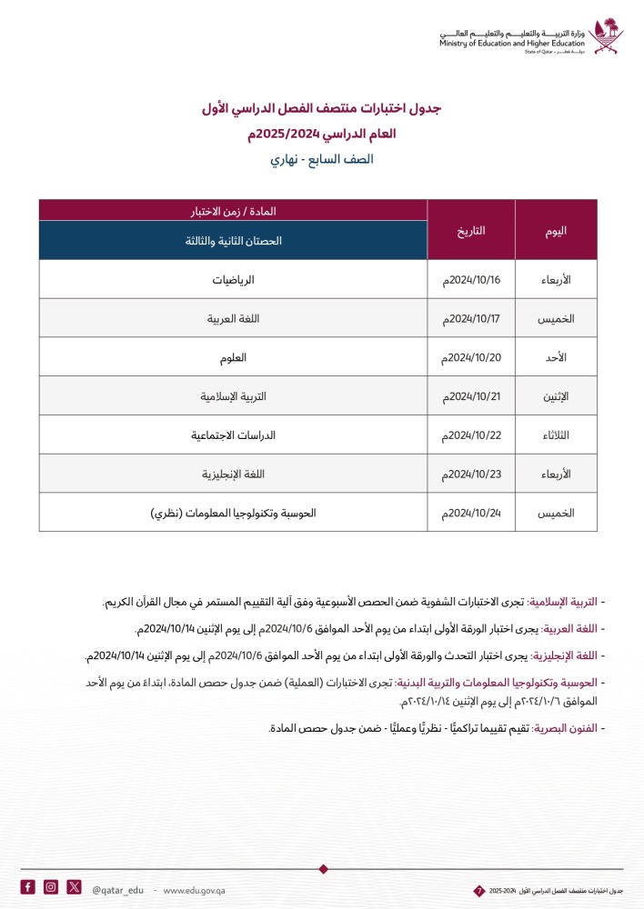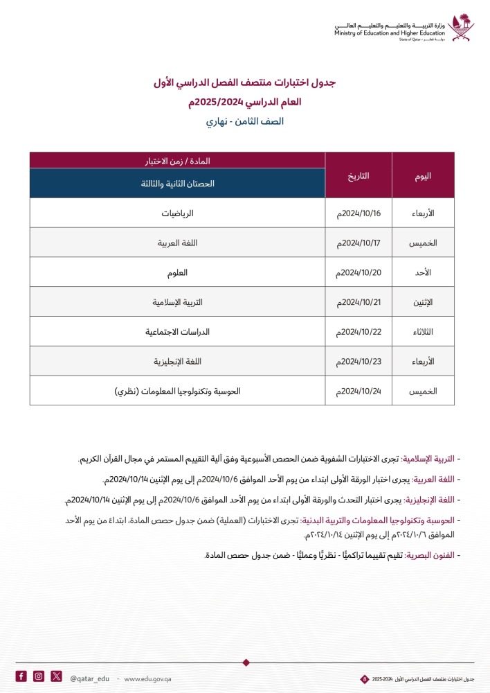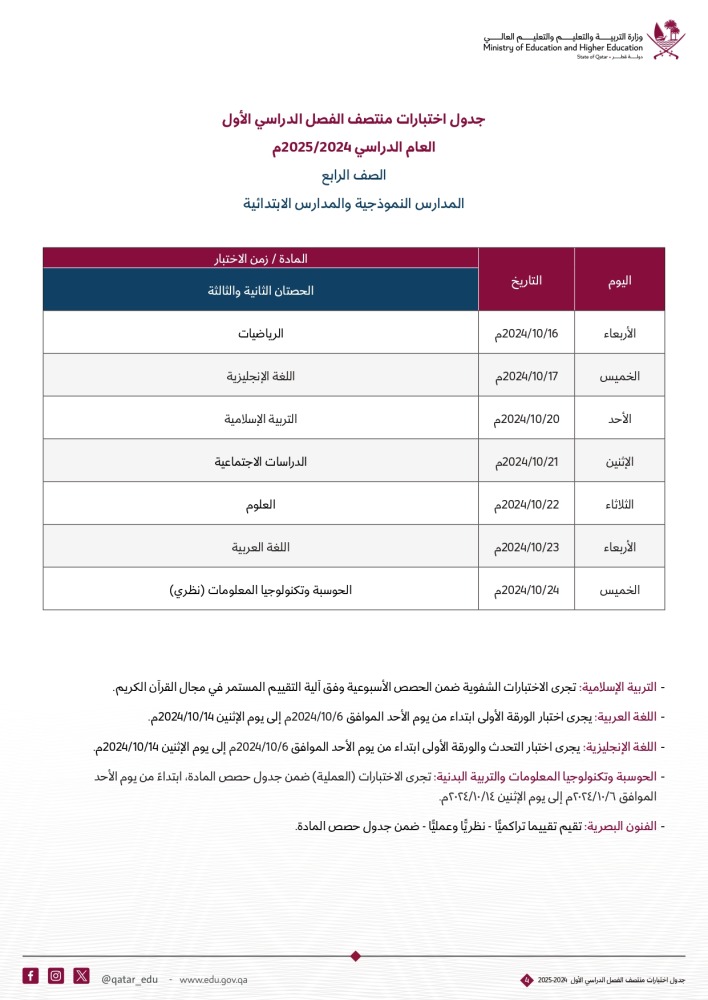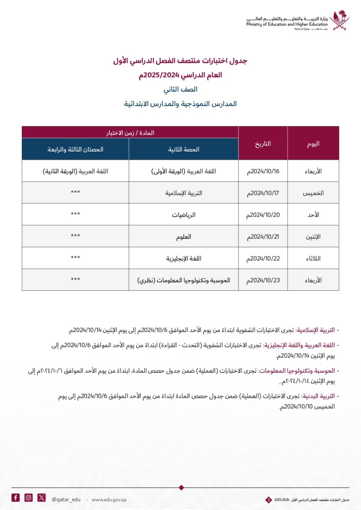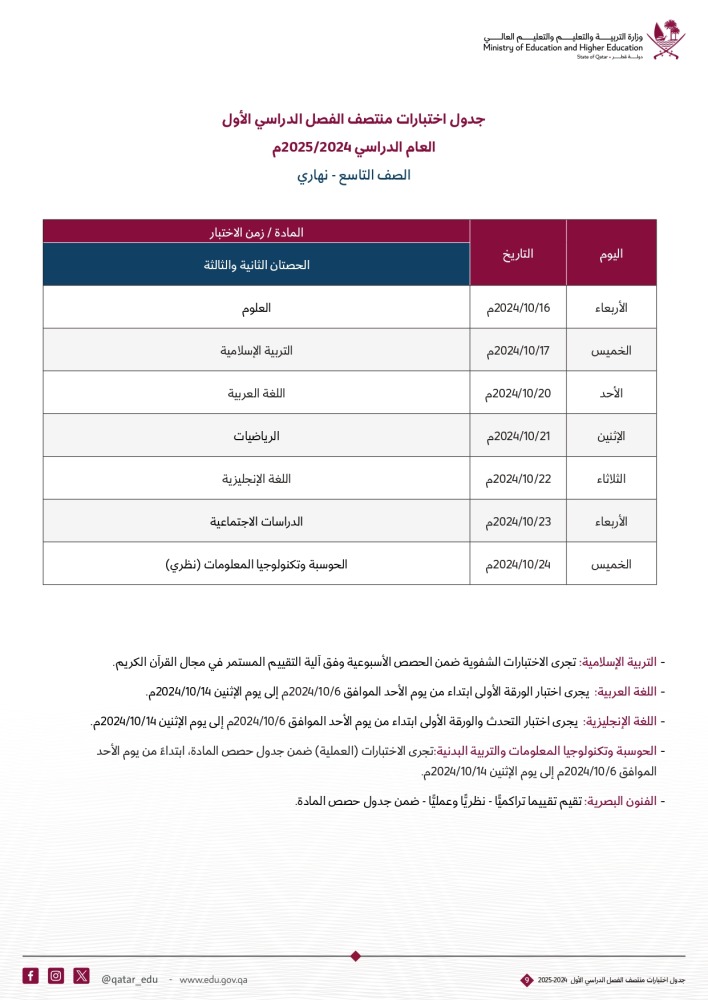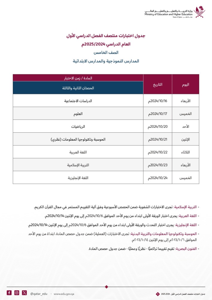 أعلنت وزارة التربية والتعليم والتعليم العالي عن جداول اختبارات منتصف الفصل الدراسي الأول للعام الدراسي 2024-2025م. للصفوف من الأول حتى الصف الثاني عشر .