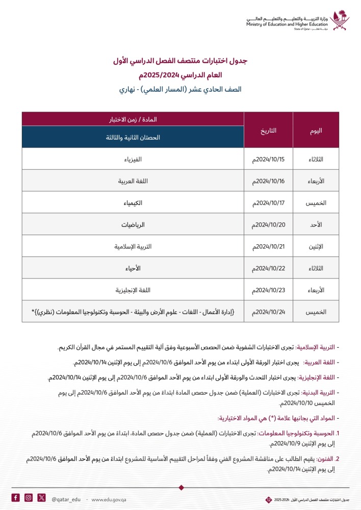 علما أن اختبارات منتصف الفصل الدراسي الأول ستبدأ في شهر أكتوبر القادم وفقا للجداول التالية: