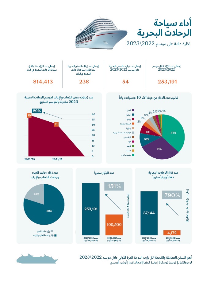 ومن بين عدد زوار بواخر السياحة البحرية الذين تم استقبالهم هذا الموسم، جاء 20% منهم ضمن رحلات التحول الجزئي التي كانت الدوحة هي نقطة الانطلاق منها والعودة إليها، وذلك بزيادة قدرها 790% مقارنة بالمسافرين الذين جاؤوا على متن هذه الرحلات خلال الموسم الماضي (4,172 راكباً). كما استقبلت قطر 54 زيارة قامت بها بواخر سياحية خلال موسم الرحلات البحرية 2022/2023، سواء كانت رحلات عبور أو رحلات ذهاب وإياب، بما يمثل زيادة قدرها 59% مقارنة بالعام الماضي.