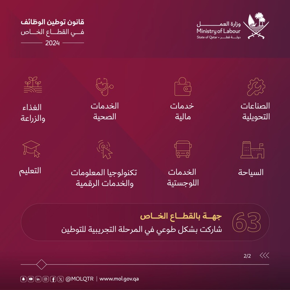 وأوضحت وزارة العمل عبر حسابها بمنصة "إكس" أن خطة توطين الوظائف في القطاع الخاص تستهدف ثمانية قطاعات استراتيجية ستكون ممثلة في المجالس القطاعية وهي الصناعات التحويلية، الخدمات اللوجستية، السياحة، تكنولوجيا المعلومات والخدمات الرقمية، الخدمات المالية، التعليم، الغذاء والزراعة، والخدمات الصحية.