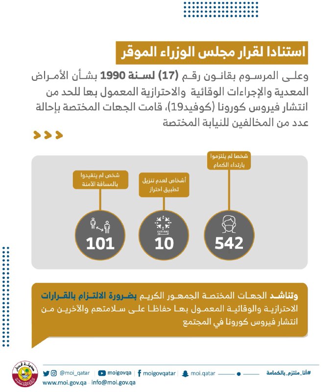 وضمت قائمة المحالين للنيابة 542 شخصاً لم يلتزموا بارتداء الكمام في الأماكن التي تتطلب ذلك، و101 شخص لم يتقيدوا بالمسافة الآمنة، و10 آخرين لعدم تنزيل تطبيق احتراز.