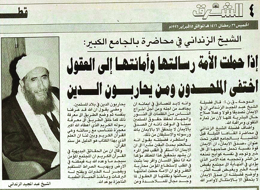 في محاضرة ألقاها بالجامع الكبير تحت عنوان "صدق الايمان " ونشرتها "الشرق" بتاريخ 26 رمضان 1416 هـ الموافق 15 فبراير 1996 م، قال فضيلة الشيخ عبد المجيد الزنداني إن في الايمان تصديقا وقولا وعملا صلاح حال البشرية كلها لأن من ثماره التقوى ومراقبة الله، مؤكدا أنه اذا نطق اللسان واقر بما يثبت في القلب لاستطاع المؤمن محاربة الكفر، ولو أن الامة حملت أمانتها ورسالتها ونقلتها الى العقول لما وجد مجال للملاحدة ومن يحاربون الدين في بلاد المسلمين.