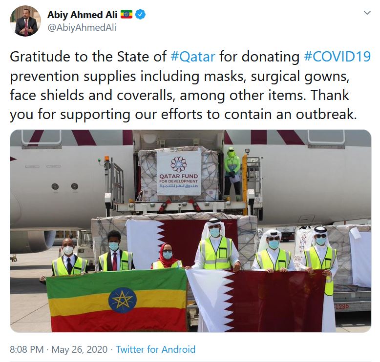 وقال رئيس الوزراء الإثيوبي في تغريدة عبر حسابه الرسمي في تويتر: ممتن لدولة قطر لتبرعها بمواد الوقاية من (كوفيد-19) والتي تشمل الأقنعة والألبسة الخاصة بالجراحة ودروع الوجه الواقية وغيرها، شكرا لدعمكم جهودنا لاحتواء تفشي المرض.