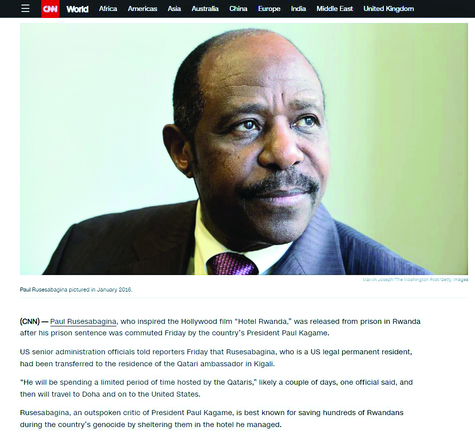 من جهتها أبرزت صحيفة ذا أست أفريكان أن التحركات الدبلوماسية لقطر ساعدت في موافقة الحكومة الرواندية على إطلاق سراح «بطل» فندق رواندا بول روسباجينا الذي يبلغ من العمر 68 عامًا وكان يقضي عقوبة بالسجن لمدة 25 عامًا. وأصدرت وزارة العدل في رواندا بيانا ذكرت فيه أنه سيتم الإفراج عن روساباجينا والمتهمين الآخرين كاليكست نسابيمانا «سانكارا» بعد تخفيف عقوبتهم «بعد النظر في طلباتهم بالعفو». تم تخفيف عقوبة روساباجينا، وشريكه في التهمة و 18 آخرين سجنوا لمشاركتهم في جرائم مماثلة كان نتيجة «لرغبة مشتركة في إعادة ضبط العلاقات بين الولايات المتحدة ورواندا».