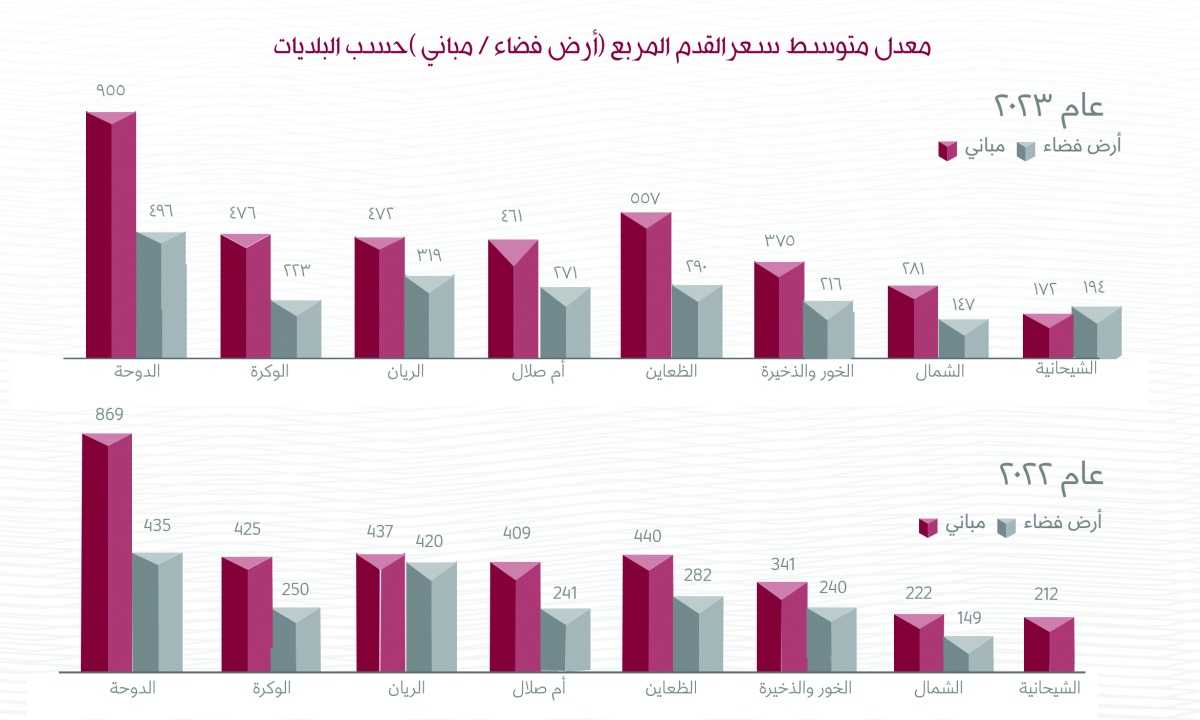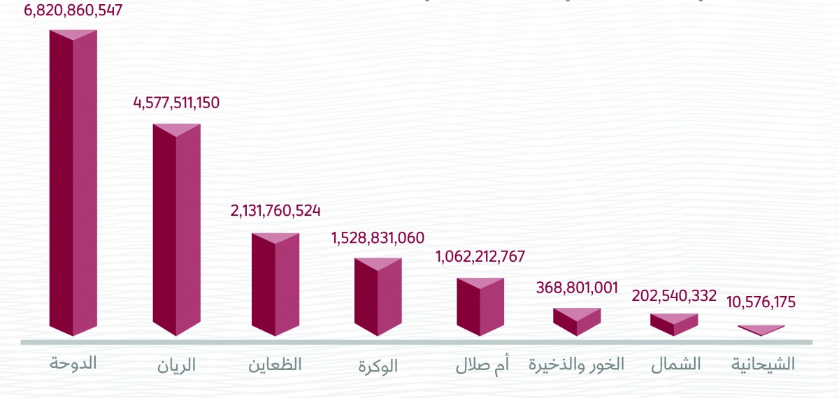 وبلغ حجم التداولات العقارية خلال عام 2023 قيمة إجمالية بنحو (16,703,093,556) ريالا، لعدد (3579) صفقة عقارية، ويبين مؤشر السوق العقاري خلال عام 2023 أن بلديات الدوحة والريان والظعاين، هي الأكثر نشاطًا من حيث القيمة المالية، حيث بلغت القيمة المالية لتعاملات بلدية الدوحة (6,820,860,547) ريالا، وسجلت بلدية الريان المرتبة الثانية بقيمة تداول بلغت (4,577,511,150) ريالا، وتأتي بلدية الظعاين بالمرتبة الثالثة بقيمة التداولات حيث بلغت (2,131,760,524) ريالا.