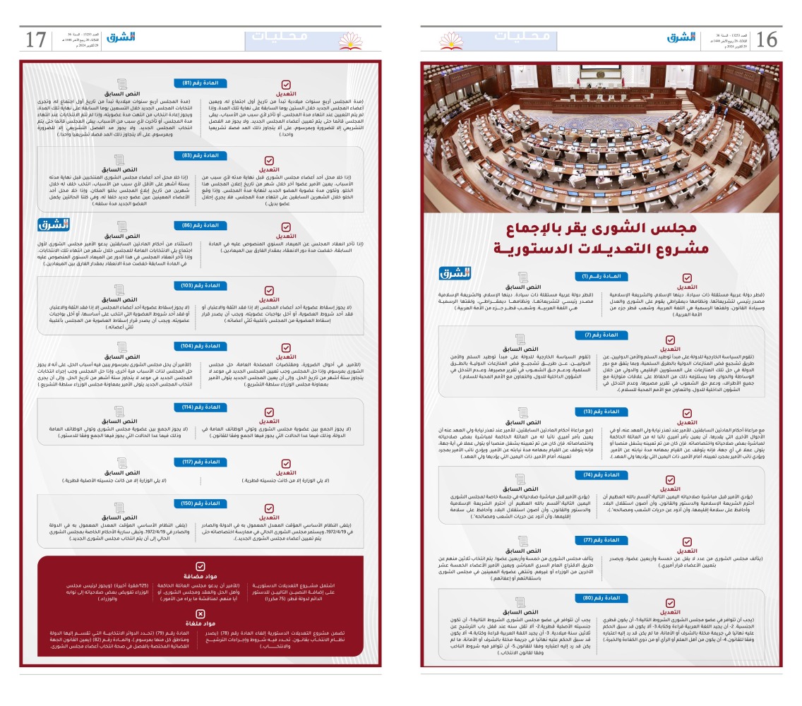 3- أن يجيد اللغة العربية قراءة وكتابة.4- ألا يكون قد سبق الحكم عليه نهائيا في جريمة مخلة بالشرف أو الأمانة، ما لم يكن قد رد إليه اعتباره وفقا للقانون.5- أن تتوافر فيه شروط الناخب وفقا لقانون الانتخاب.) المادة رقم (81) أصبحت في النص المقترح (مدة المجلس أربع سنوات ميلادية تبدأ من تاريخ أول اجتماع له، ويعين أعضاء المجلس الجديد خلال الستين يوما السابقة على نهاية تلك المدة، وإذا لم يتم التعيين عند انتهاء مدة المجلس، أو تأخر لأي سبب من الأسباب، يبقى المجلس قائما حتى يتم تعيين أعضاء المجلس الجديد. ولا يجوز مد الفصل التشريعي إلا للضرورة وبمرسوم، على ألا يتجاوز ذلك المد فصلا تشريعيا واحدا.)، بعد أن كانت (مدة المجلس أربع سنوات ميلادية تبدأ من تاريخ أول اجتماع له، وتجرى انتخابات المجلس الجديد خلال التسعين يوما السابقة على نهاية تلك المدة، ويجوز إعادة انتخاب من انتهت مدة عضويته، وإذا لم تتم الانتخابات عند انتهاء مدة المجلس، أو تأخرت لأي سبب من الأسباب، يبقى المجلس قائما حتى يتم انتخاب المجلس الجديد. ولا يجوز مد الفصل التشريعي إلا للضرورة وبمرسوم، على ألا يتجاوز ذلك المد فصلا تشريعيا واحدا.)