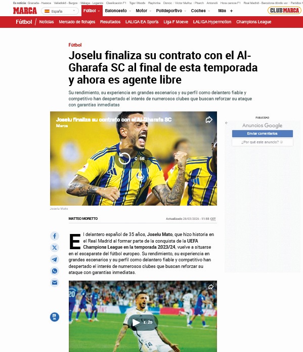 أكدت الصحيفة الرياضية الاسبانية ماركا أن خوسيلو، مهاجم الغرافة، ما يزال يثير اهتمام العديد من الأندية الأوروبية التي ترغب في الاستفادة من خدماته، وأوضحت ماركا أن المهاجم المخضرم البالغ من العمر 35 عاما والذي ينتهي عقده في يونيو 2026 مع الغرافة تلقى اتصالات من عدة أندية تفكر جديا في ضمه إلى صفوفها عطفا على ما يمكنه تقديمه داخل الملعب وخارجه، وقدرته على حسم المباريات، ومهارته في الكرات الهوائية، وامتلاكه لخبرة واسعة...وأضافت ماركا أن خوسيلو الذي صنع التاريخ مع ريال مدريد بمساهمته في تتويجه بدوري أبطال أوروبا لموسم (2023-2024)، والذي لا يزال لديه الكثير ليقدمه في ملاعب أمامه أسابيع حاسمة لتحديد مستقبله، مع وجود عروض عديدة وسيناريوهات محتملة مختلفة تقربه من العودة إلى كرة القدم الأوروبية، وكان الغرافة قد تعاقد في صيف 2024 لمدة عامين مع خوسيلو قادما من ريال مدريد الذي كان قد بدأ مسيرته الكروية في الأكاديمية التابعة للنادي ثم لعب لعدة أندية أوروبية أبرزها سيلتا فيغو، هوفنهايم، أينتراخت فرانكفورت، هانوفر، ستوك سيتي، نيوكاسل، ألافيس وإسبانيول، كما أنه دافع عن ألوان منتخب بلاده، وساهم خوسيلو في قيادة الغرافة إلى التتويج بلقب بطولة كأس الأمير 2025، خصوصا عندما سجل الهدف الثاني في المباراة النهائية التي فاز فيها فريقه على الريان (2-1).
