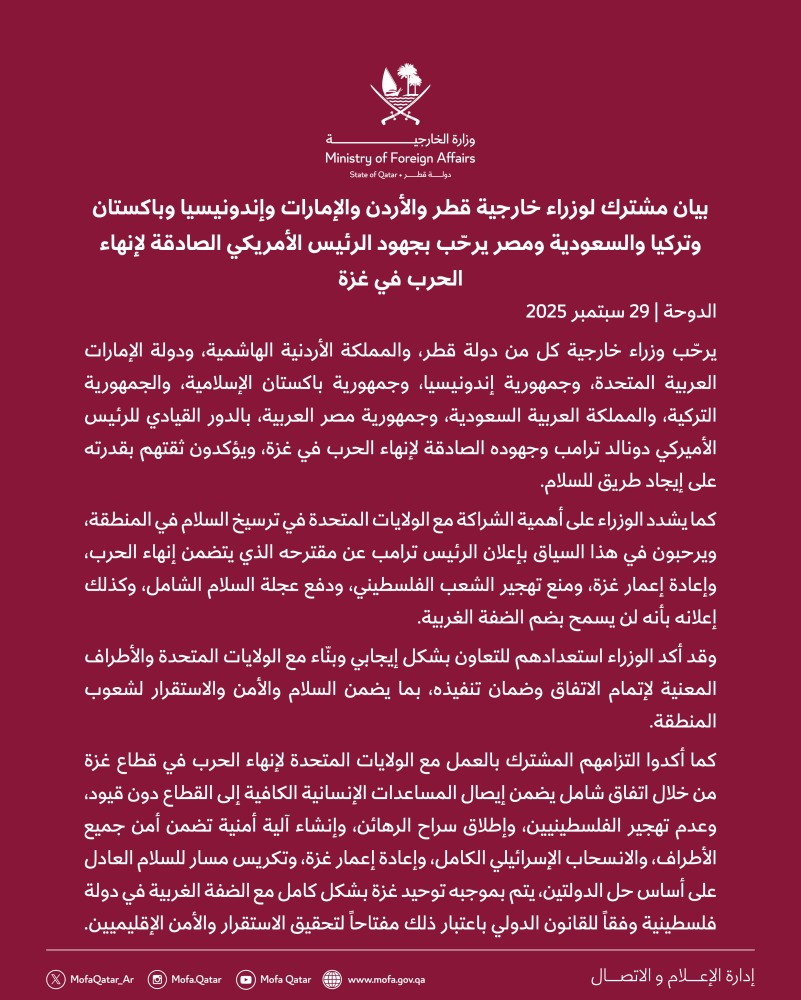 أعرب وزراء خارجية قطر والأردن والإمارات وإندونيسيا وباكستان وتركيا والسعودية ومصر في بيان مشترك، اليوم الإثنين، عن ترحيبهم بجهود الرئيس الأمريكي دونالد ترامب لإنهاء الحرب في غزة.