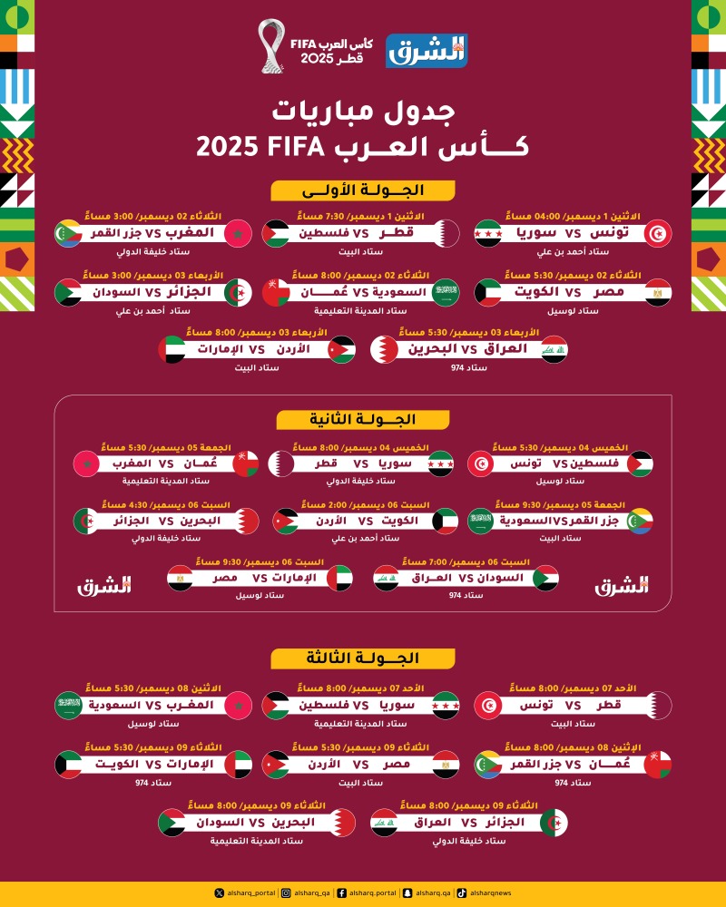 موقع الشرق ينشر الجدول الكامل لدور المجموعات في بطولة كأس العرب لكرة القدم FIFA قطر2025، يتضمن المنتخبات ومواعيد المباريات والاستادات.