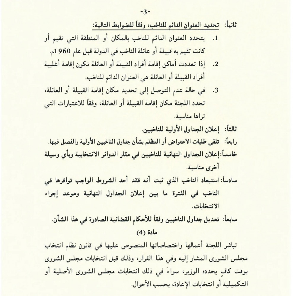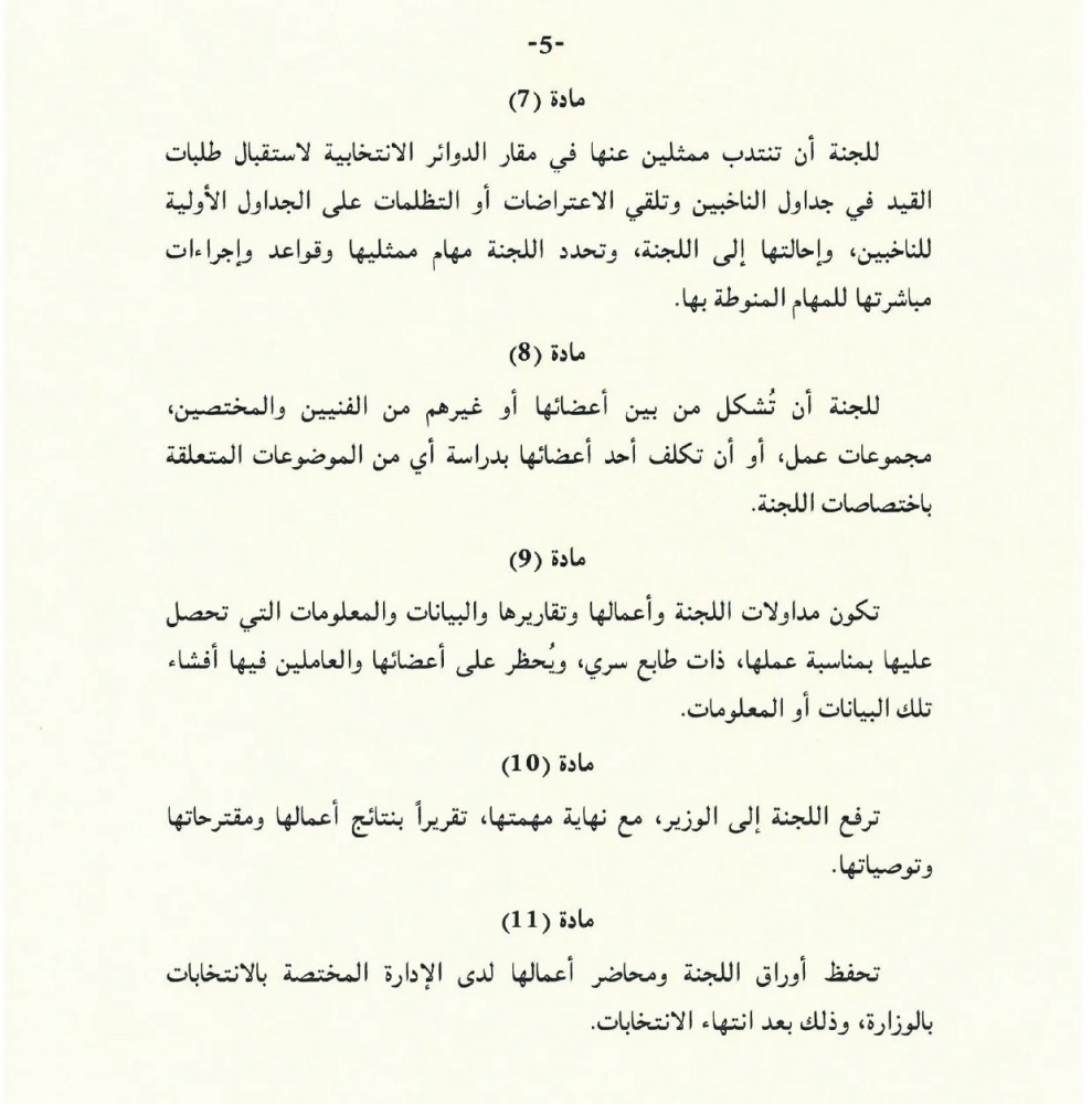ونص القرار على أن "تباشر اللجنة أعمالها واختصاصاتها المنصوص عليها في قانون نظام انتخاب مجلس الشورى المشار إليه وفي هذا القرار، وذلك قبل انتخابات مجلس الشورى بوقت كاف يحدده الوزير، سواء في ذلك انتخابات مجلس الشورى الأصلية أو التكميلية، أو انتخابات الإعادة، بحسب الأحوال".
