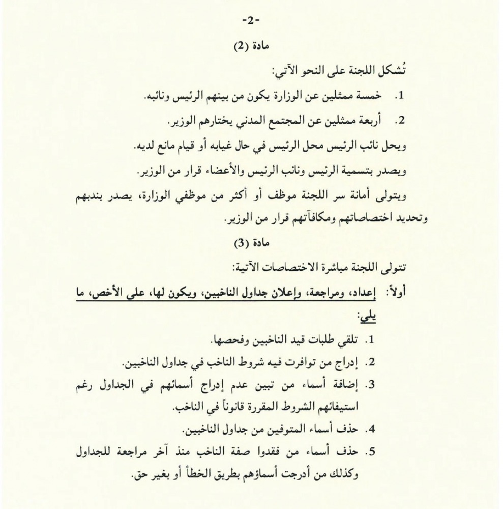 وينص القرار على أن تشكل اللجنة من خمسة ممثلين عن الوزارة (وزارة الداخلية) يكون من بينهم الرئيس ونائبه، وأربعة ممثلين عن المجتمع المدني يختارهم الوزير، ويحل نائب الرئيس محل الرئيس في حال غيابه أو قيام مانع لديه، ويصدر بتسمية الرئيس ونائب الرئيس والأعضاء قرار من الوزير.