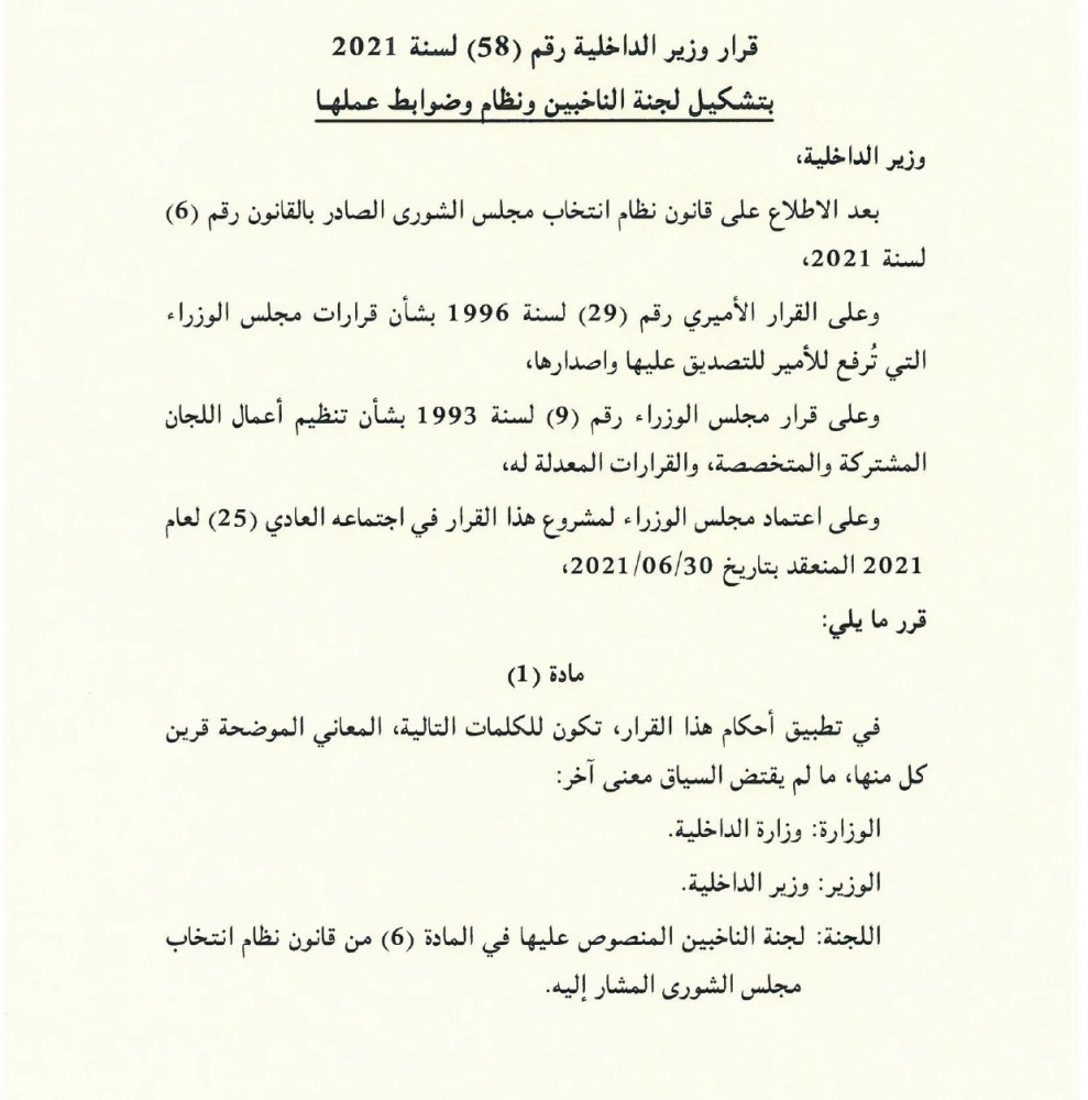 أصدر معالي الشيخ خالد بن خليفة بن عبدالعزيز آل ثاني رئيس مجلس الوزراء ووزير الداخلية، اليوم، قرارا بتشكيل لجنة الناخبين المنصوص عليها في المادة 6 من قانون نظام انتخاب مجلس الشورى الصادر بالقانون رقم 6 لسنة 2021، ونظام وضوابط عملها.
