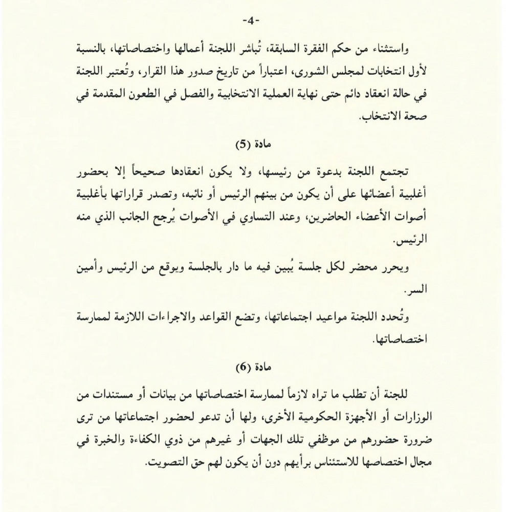 كما جاء في القرار، أنه استثناء من حكم الفقرة السابقة، تباشر اللجنة أعمالها واختصاصاتها بالنسبة لأول انتخابات لمجلس الشورى اعتبارا من تاريخ صدور هذا القرار، وتعتبر اللجنة في حالة انعقاد دائم حتى نهاية العملية الانتخابية والفصل في الطعون المقدمة في صحة الانتخابات.