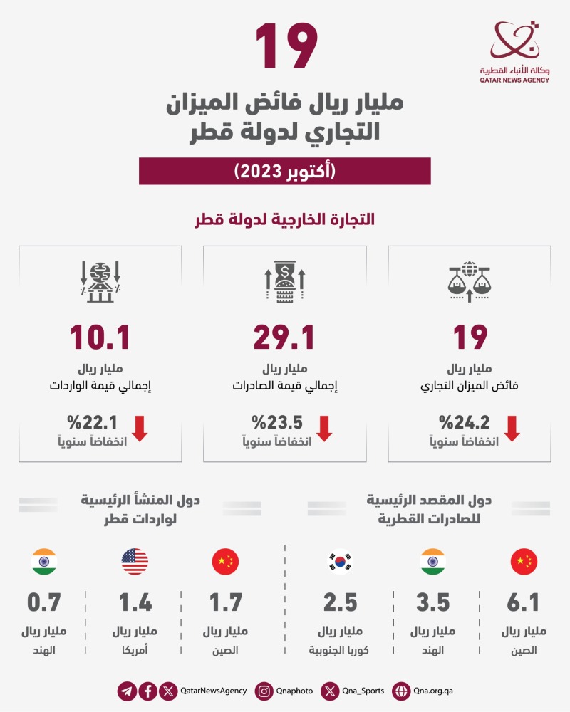 سجل الناتج المحلي الإجمالي للدولة، خلال الربع الثاني من العام الجاري، نموا بنسبة 1 % على أساس سنوي، مقارنة مع الربع ذاته من العام الماضي، بعد أن حقق ارتفاعا بنسبة 0.5 بالمئة في الربع الأول. فيما حقق الميزان التجاري السلعي والذي يمثل الفرق بين إجمالي الصادرات والواردات خلال شهر أكتوبر الماضي، فائضا مقداره 19 مليار ريال، مسجلا بذلك انخفاضا قدره 6.1 مليار ريال أي ما نسبته 24.2 بالمئة مقارنة ببيانات شهر أكتوبر من العام السابق 2022، وتراجعا مقداره 0.8 مليار ريال تقريبا أي ما نسبته 4.2 بالمئة مقارنة مع شهر سبتمبر عام 2023. وأفادت بيانات جهاز التخطيط والإحصاء، بأن إجمالي قيمة الصادرات القطرية (التي تشمل الصادرات ذات المنشأ المحلي وإعادة التصدير) 29.1 مليار ريال تقريبا أي بانخفاض نسبته 23.5 بالمئة، مقارنة ببيانات شهر أكتوبر عام 2022، وبتراجع نسبته 0.7 بالمئة مقارنة بشهر سبتمبر عام 2023. وانخفضت قيمة الواردات السلعية خلال شهر أكتوبر عام 2023، لتصل إلى نحو 10.1 مليار ريال، بانخفاض نسبته 22.1 بالمئة مقارنة ببيانات شهر أكتوبر عام 2022، وبارتفاع نسبته 6.9 بالمئة مقارنة بشهر سبتمبر عام 2023.