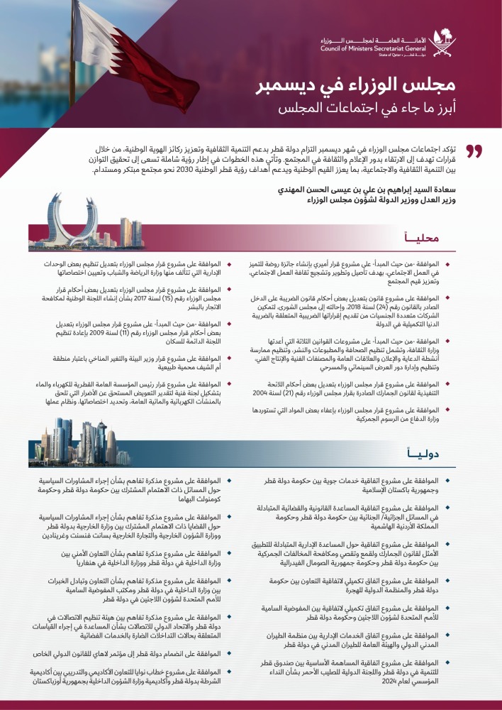 ونقلت عن سعادة السيد/ إبراهيم بن علي المهندي، وزير العدل ووزير الدولة لشؤون مجلس الوزراء، قوله: تؤكد اجتماعات مجلس الوزراء في شهر ديسمبر التزام دولة قطر بدعم التنمية الثقافية وتعزيز ركائز الهوية الوطنية، من خلال قرارات تهدف إلى الارتقاء بدور الإعلام والثقافة في المجتمع، وتأتي هذه الخطوات في إطار رؤية شاملة تسعى إلى تحقيق التوازن بين التنمية الثقافية والاجتماعية، بما يعزز القيم الوطنية ويدعم أهداف رؤية قطر الوطنية 2030 نحو مجتمع مبتكر مستدام.